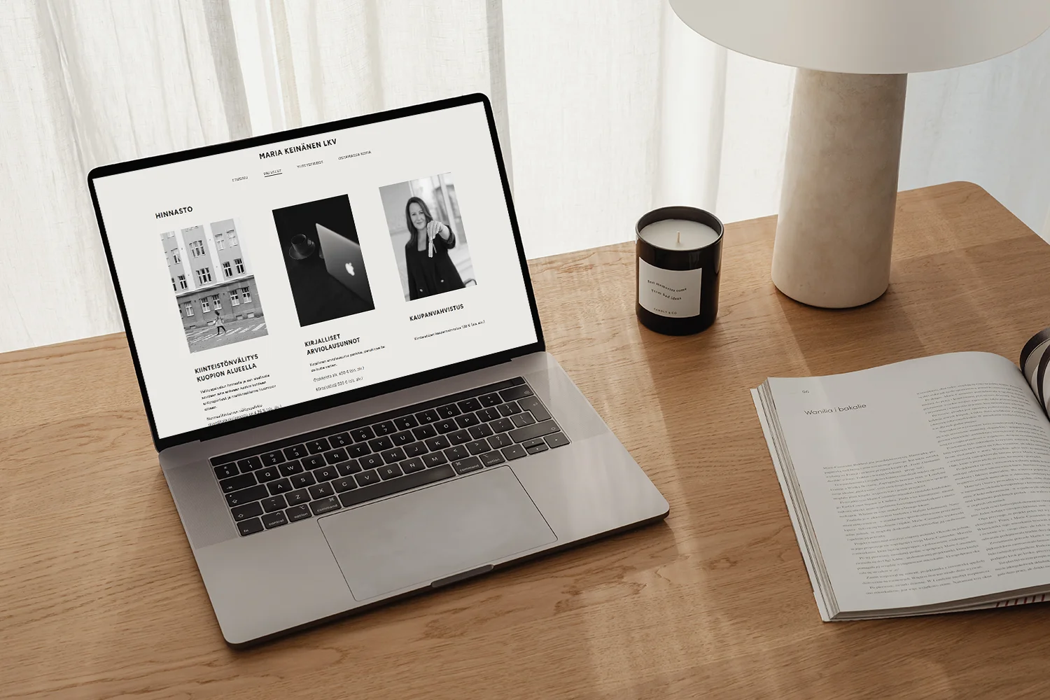 Marian sivut ovat selkeät ja kevyet, samoin kuin yhteistyö Marian kanssa. Värimaailma on hillitty, mutta mukana on ripaus mustaa tuomassa kontrastia ja kuvaamassa Marian kokemuksen tuomaa vahvaa ammattitaitoa. Maria saakin usein asiakkailtaan palautetta tehokkuudesta ja sujuvasta myyntiprosessista.